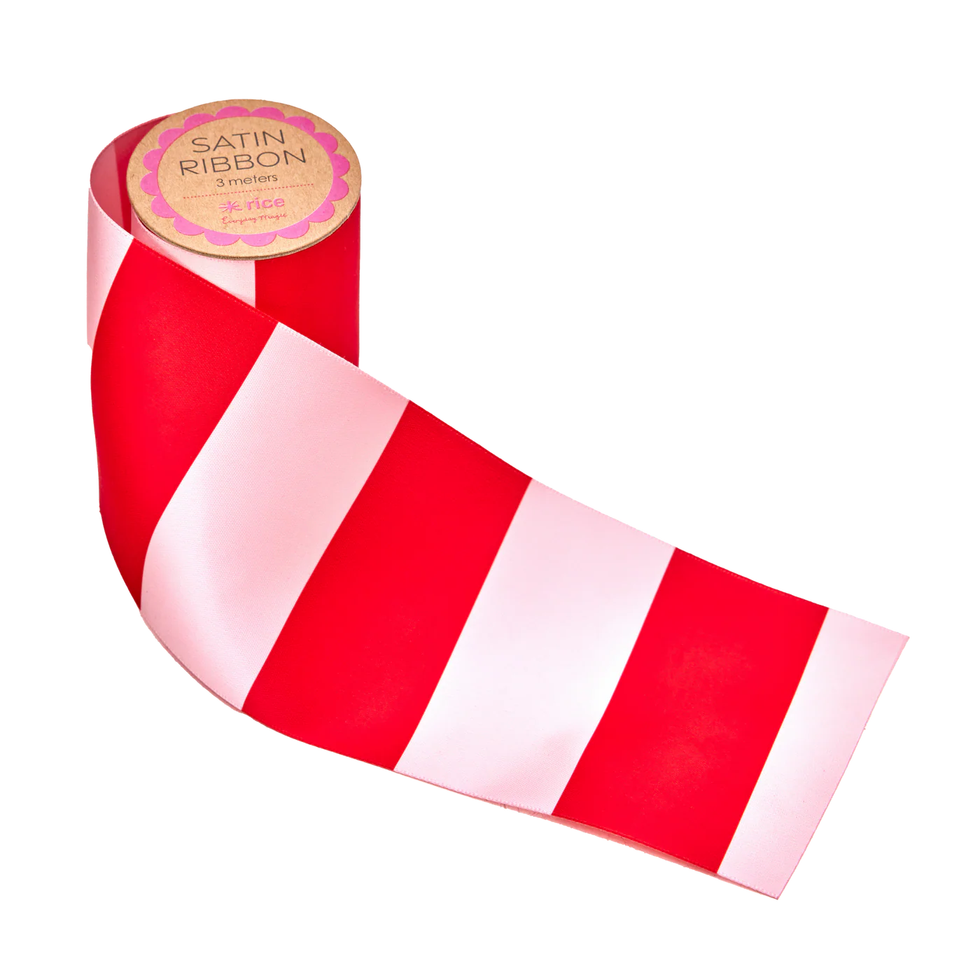 Dette brede satengbåndet i røde og rosa striper gir øyeblikkelig energi og personlighet til julegaver, bursdagsgaver og kreative prosjekter.