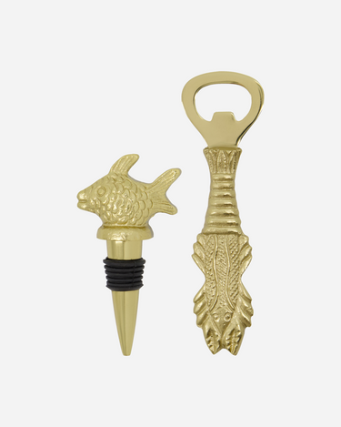 Barutstyr i gullfinish – vinpropp med fisk og flaskeåpner med hummerhåndtak