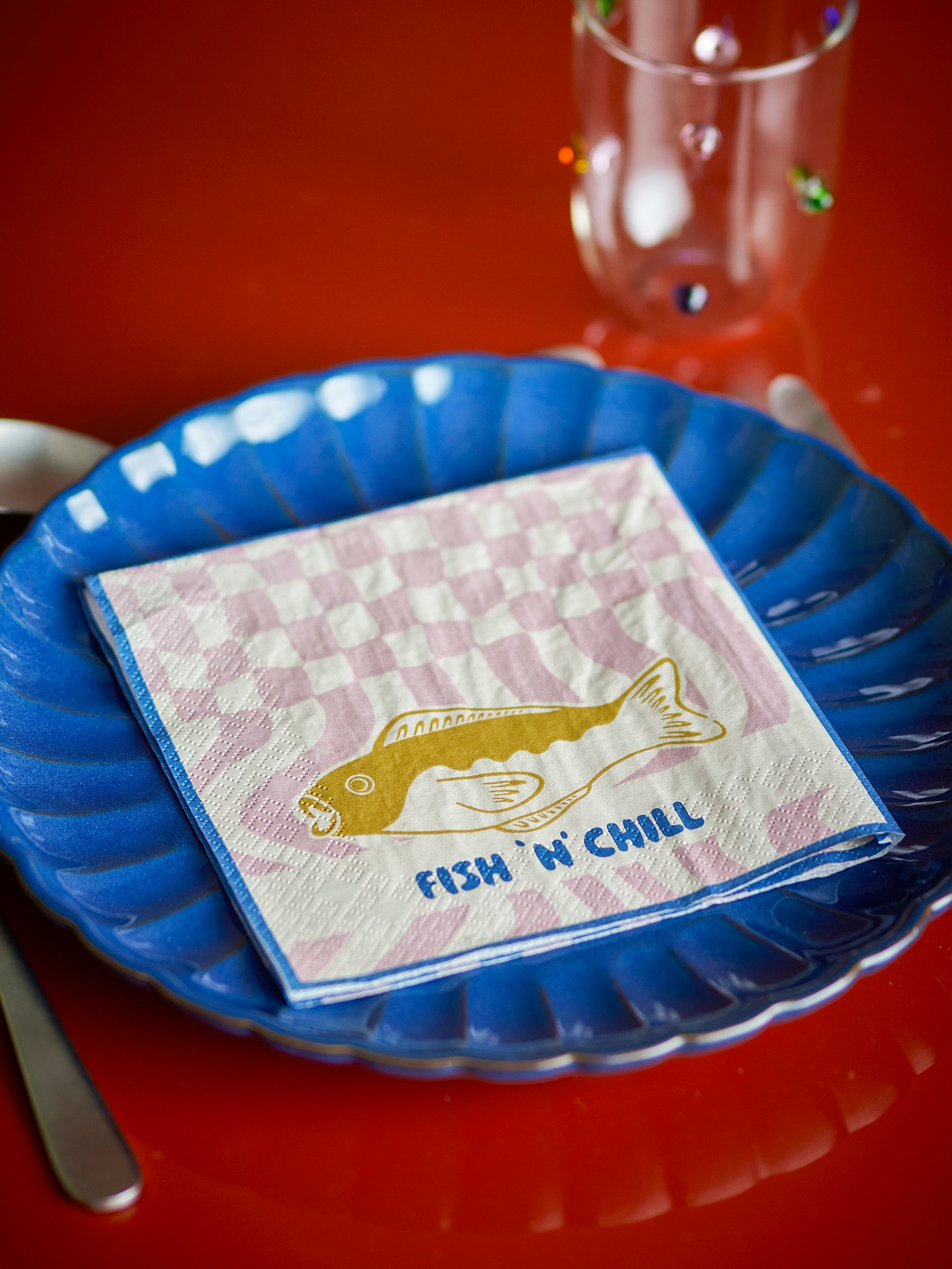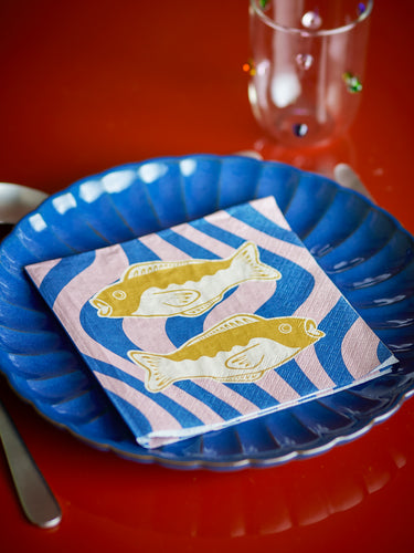 De grafiske fiskemotivene og de friske fargene gir et lekent og sommerlig uttrykk som passer like godt til hverdagsmiddagen som til festlige anledninger.