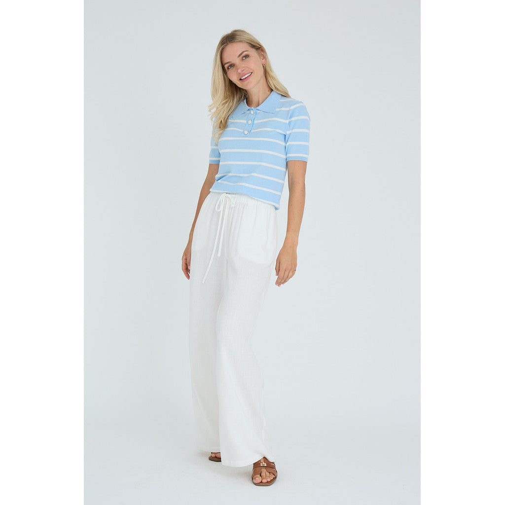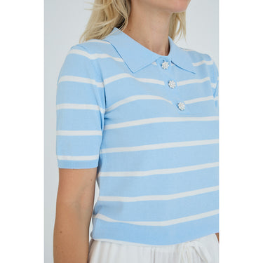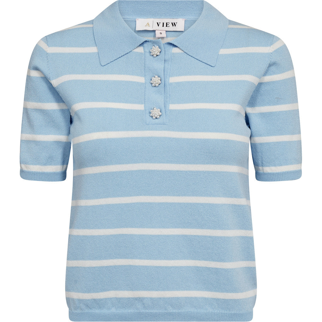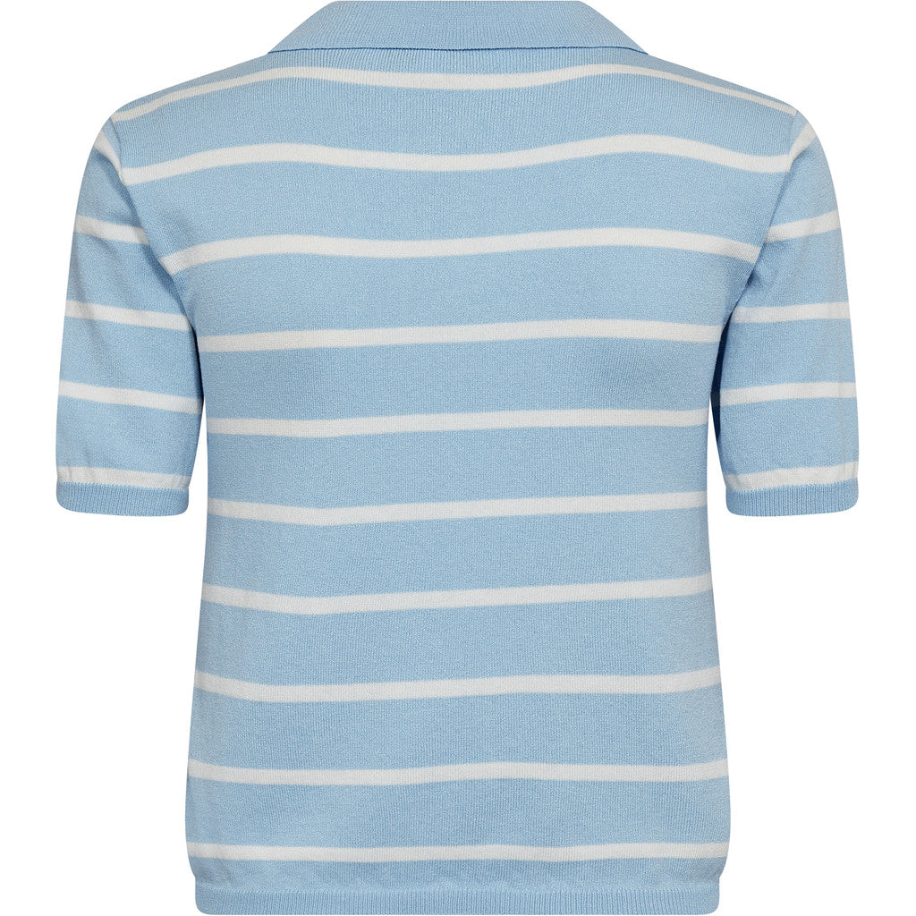 Elo Knit Polo strikket bluse med korte ermer, polo-krage og perleknapper med horisontale striper – tilgjengelig hos Mitt Lille Hjem i butikk og nettbutikk.
