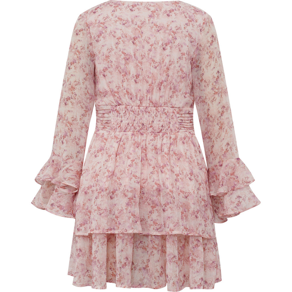 Florella Short Dress er en kort og elegant kjole med et romantisk blomsterprint og delikate volanger på ermene. Den markerte midjen gir en flatterende silhuett, mens V-halsen skaper et lett og feminint uttrykk. De lange ermene tilfører balanse til den korte lengden og gjør kjolen like fin til hverdagsbruk som til selskap.