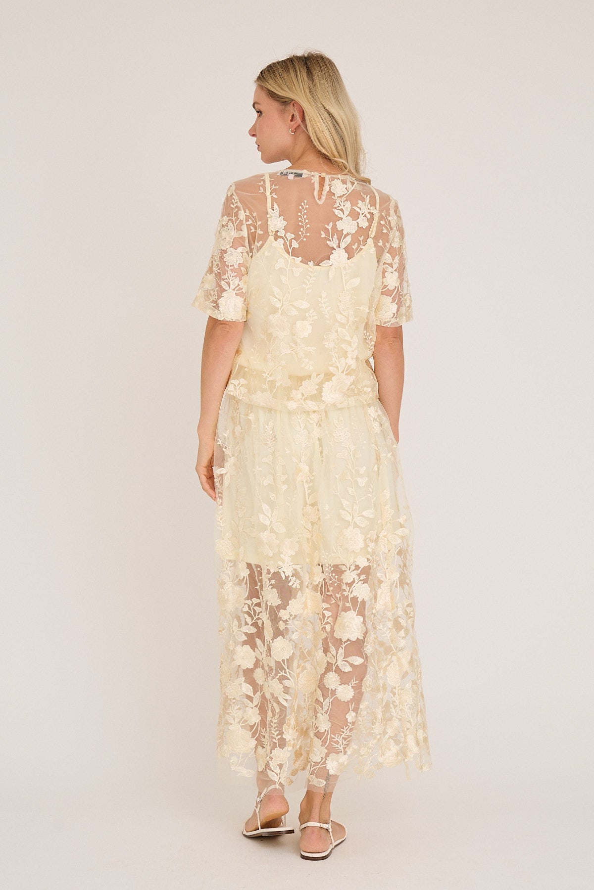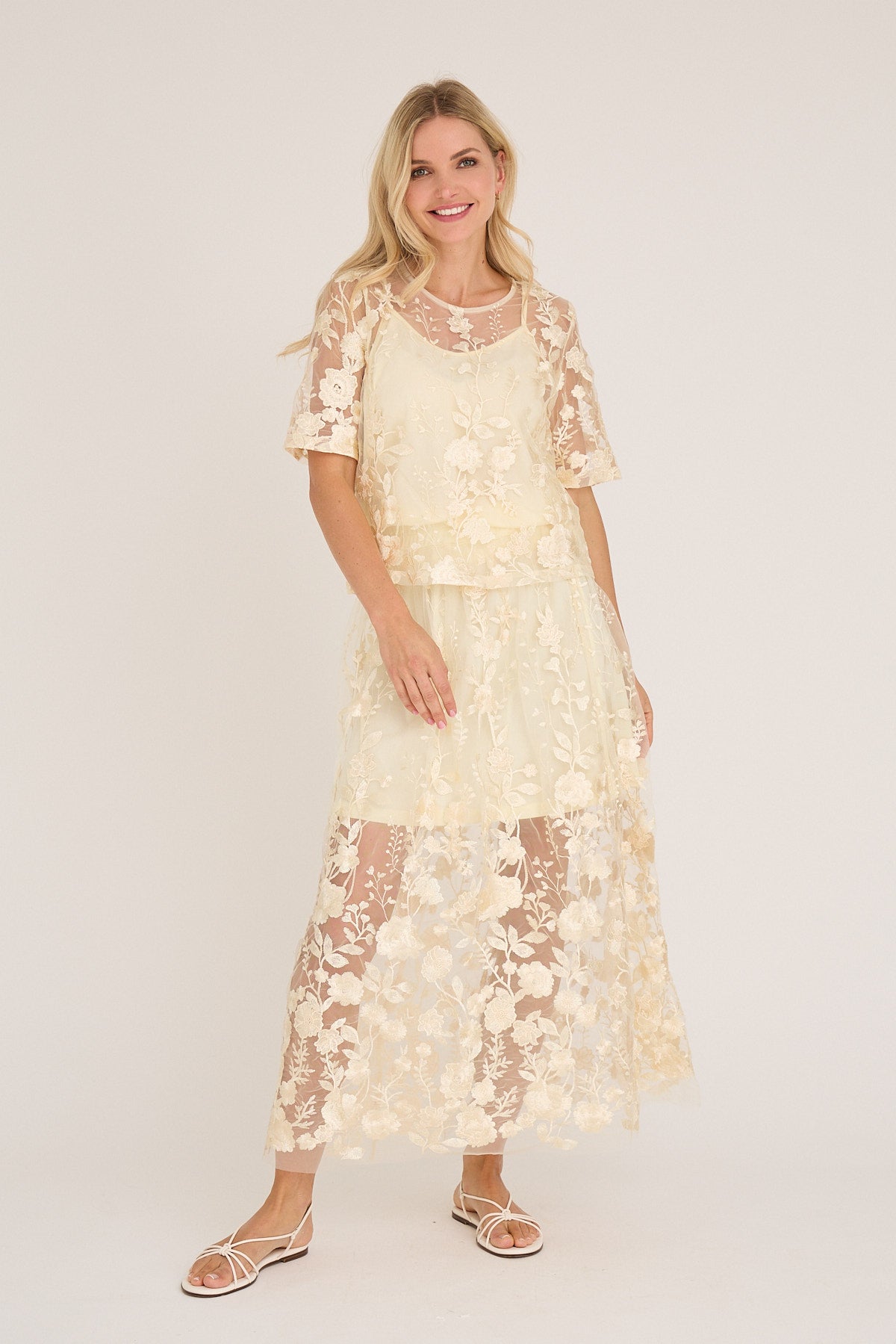 Blusen har korte, løse ermer som gir en lett og behagelig passform, mens de delikate blomsterbroderiene tilfører tekstur og et eksklusivt preg. Den lukkes diskret med en knapp i nakken, noe som gir en ren og elegant finish.