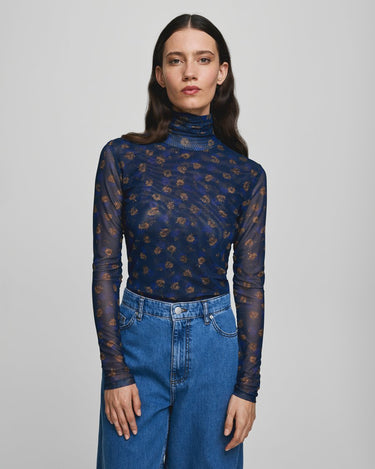 Moss Copenhagen Ginie Illenora Top AOP – langermet tettsittende meshbluse med høy hals og blomsterprint. Laget i resirkulert polyester og elastan.