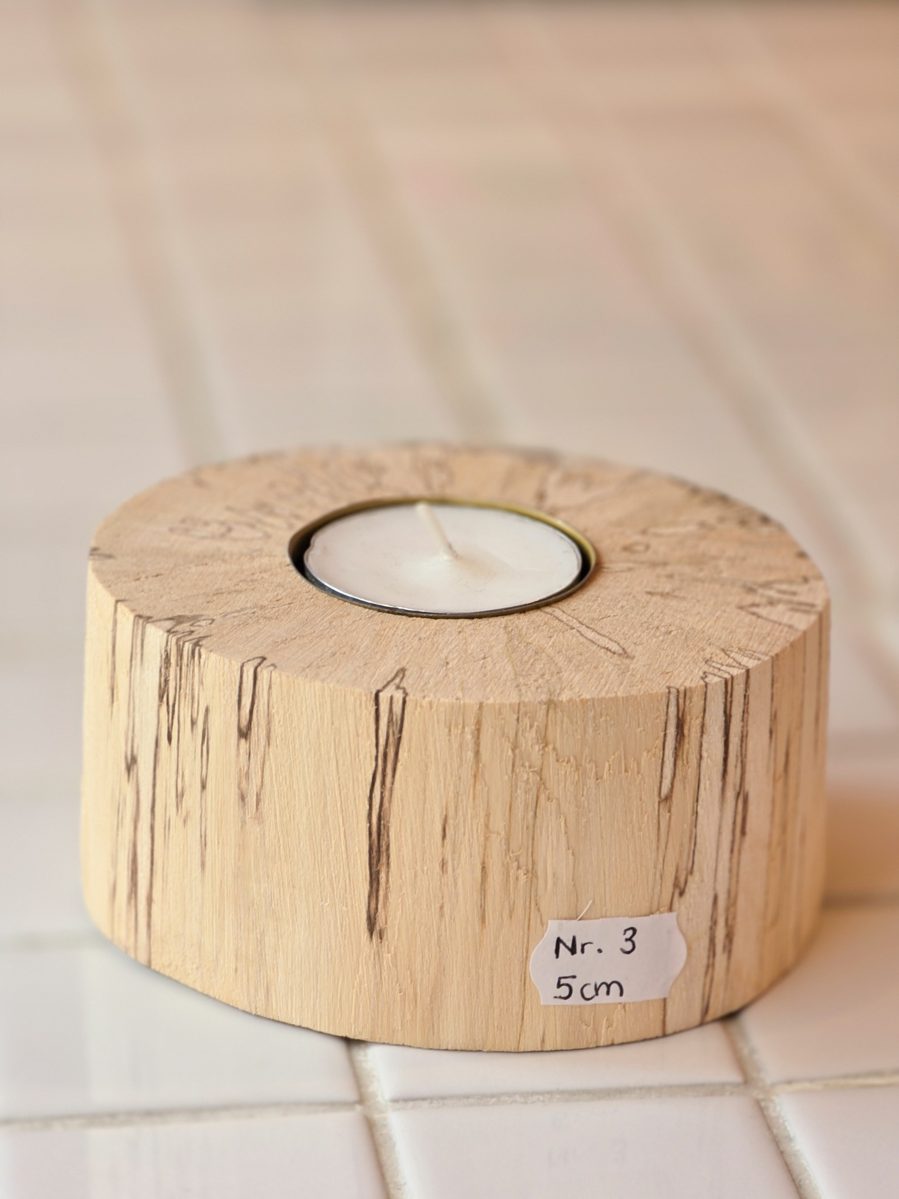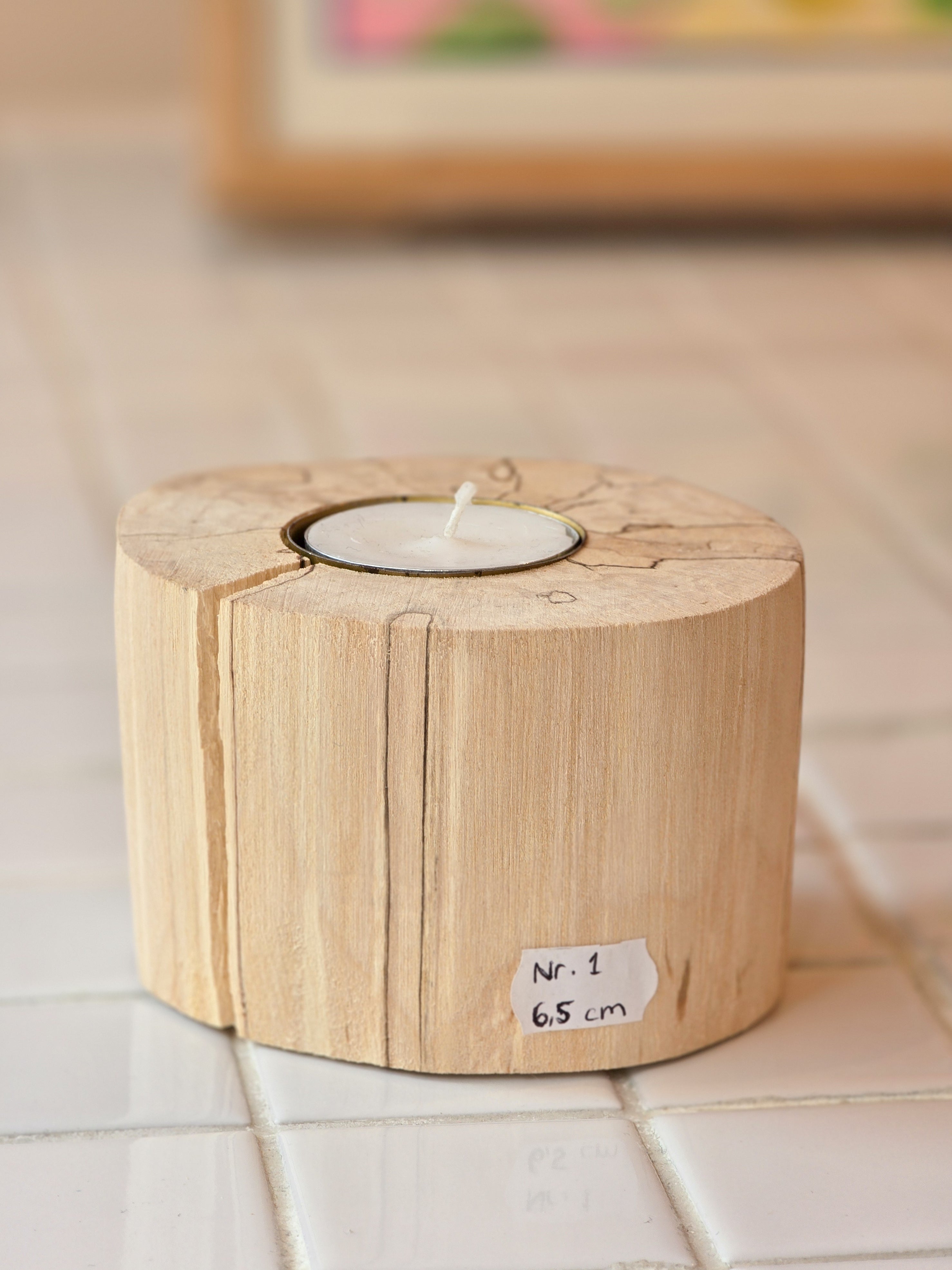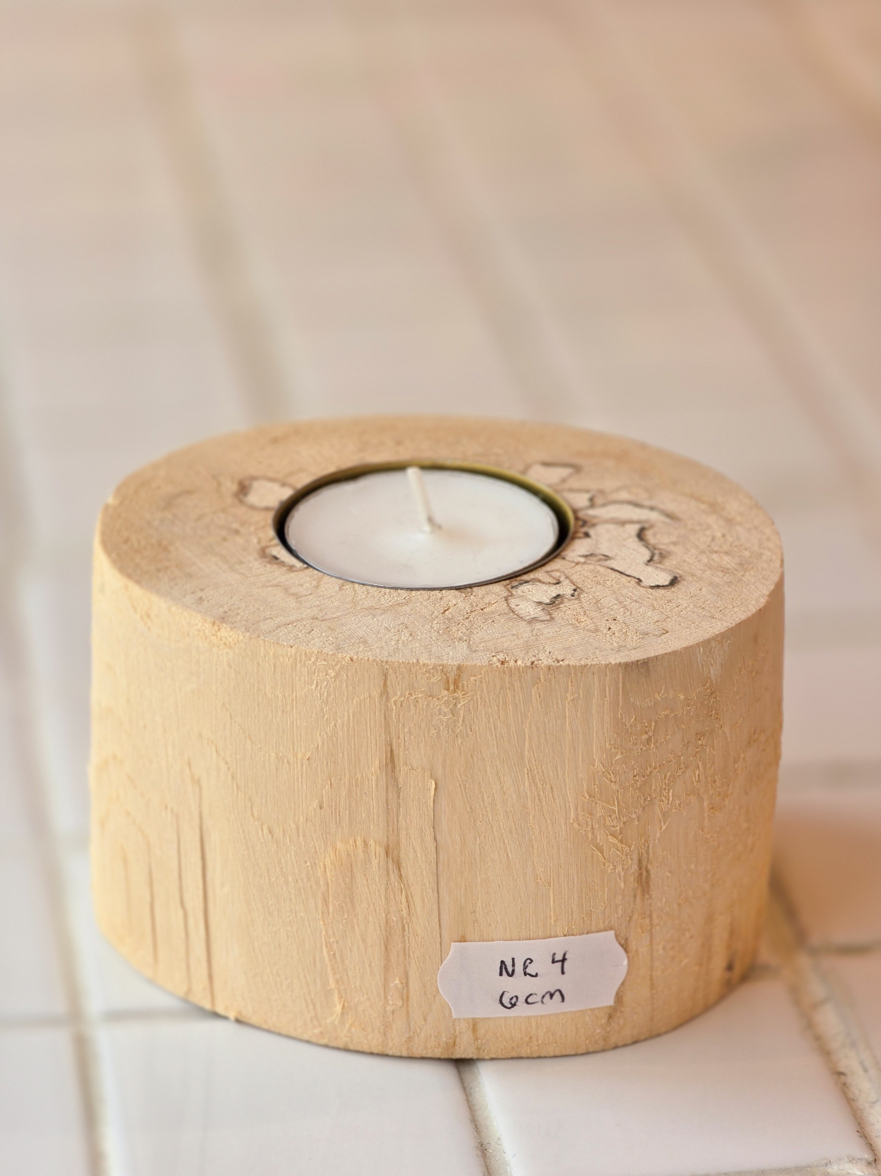 Telysholdere laget av norskt tre. Kommer i forskjellige størrelser. Alle produkter er unike, med sitt eget utseende.