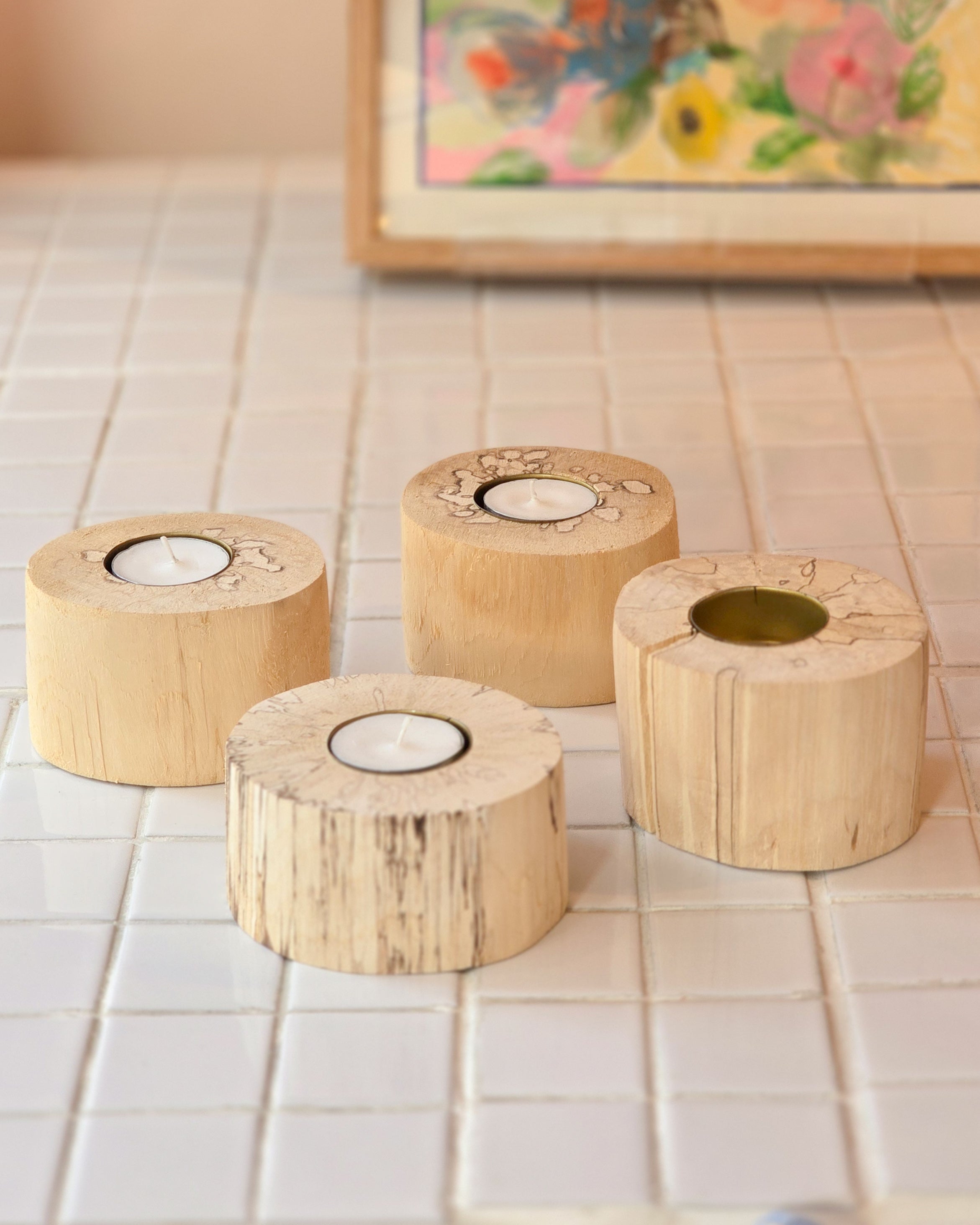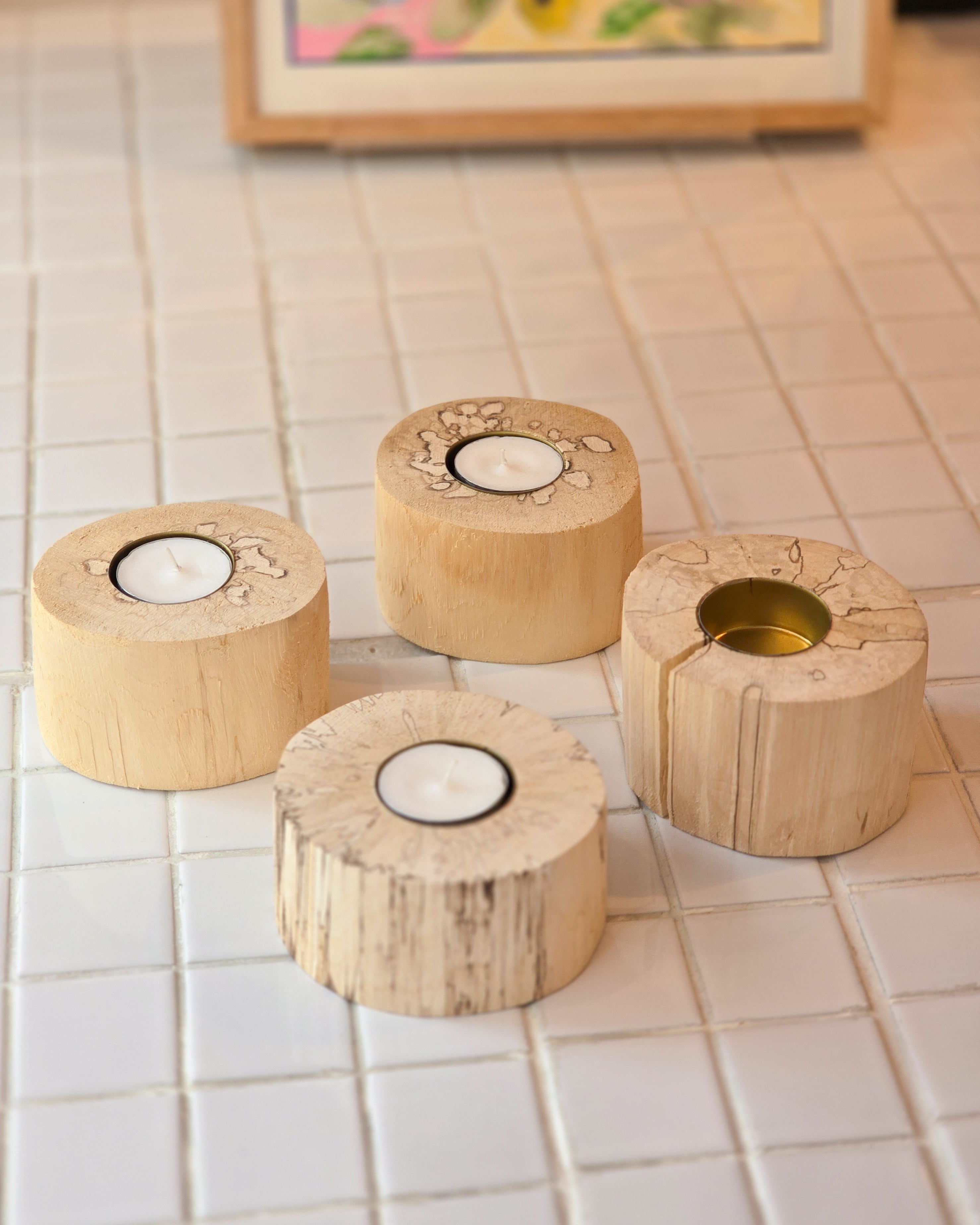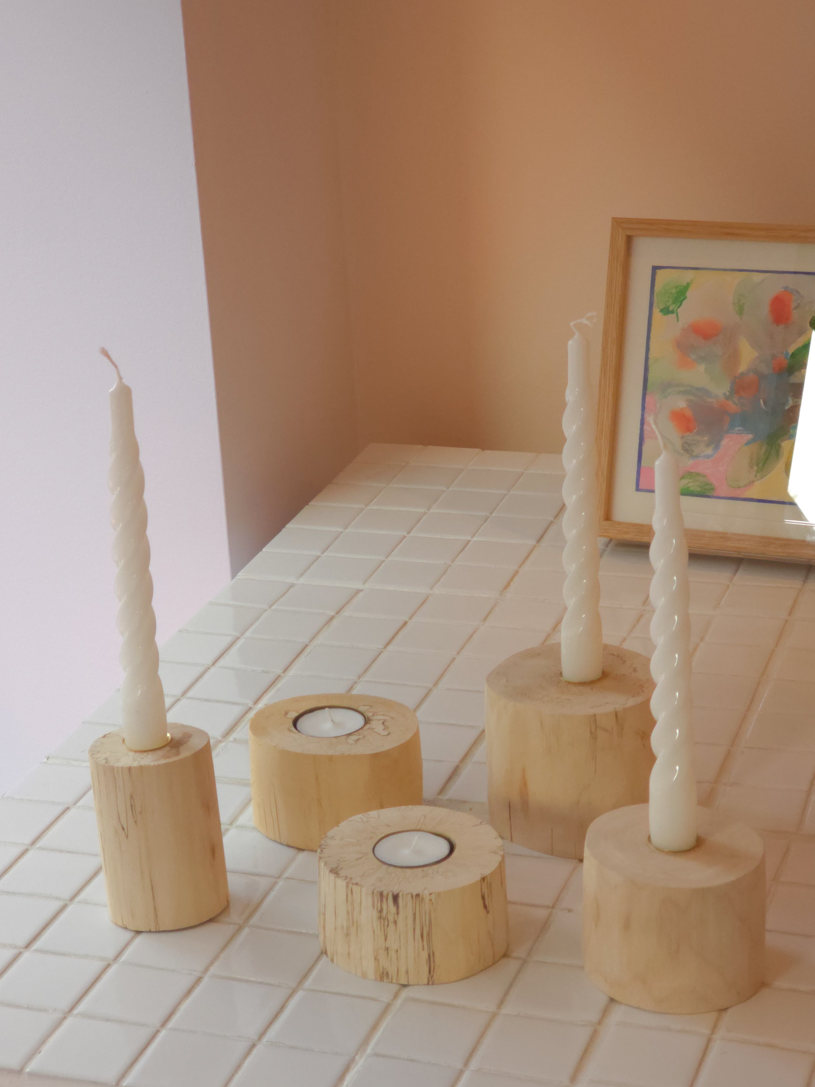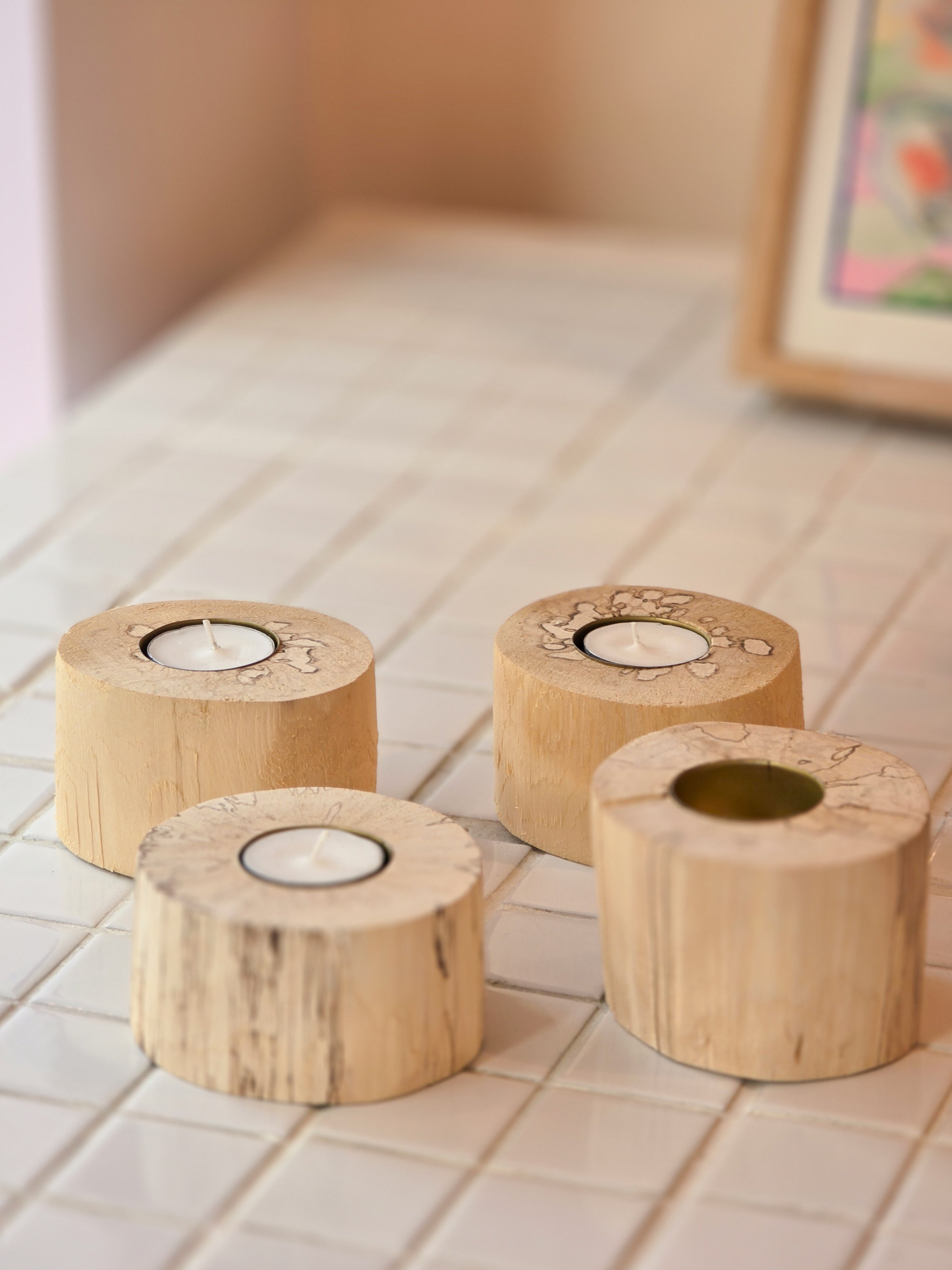Telysholdere laget av norskt tre. Kommer i forskjellige størrelser. Alle produkter er unike, med sitt eget utseende.