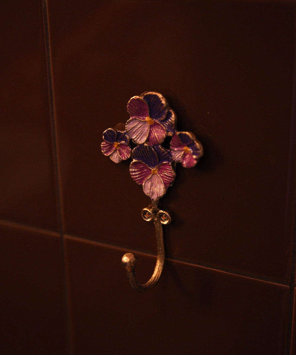 Valery Violet Field Hook – håndlaget krok i resirkulert messing fra India med håndmalte fioler i lilla og gule toner. Størrelse 11 × 6 × 4,5 cm. Dekorativ og funksjonell krok til hjemmet.