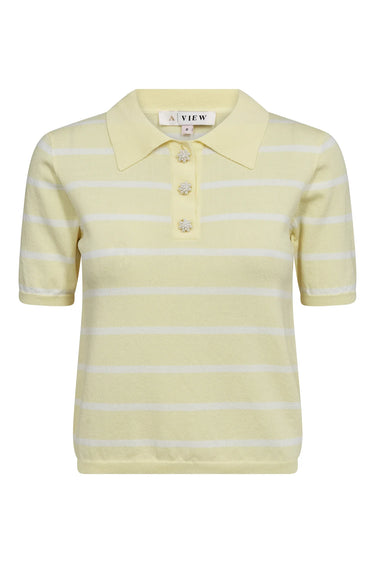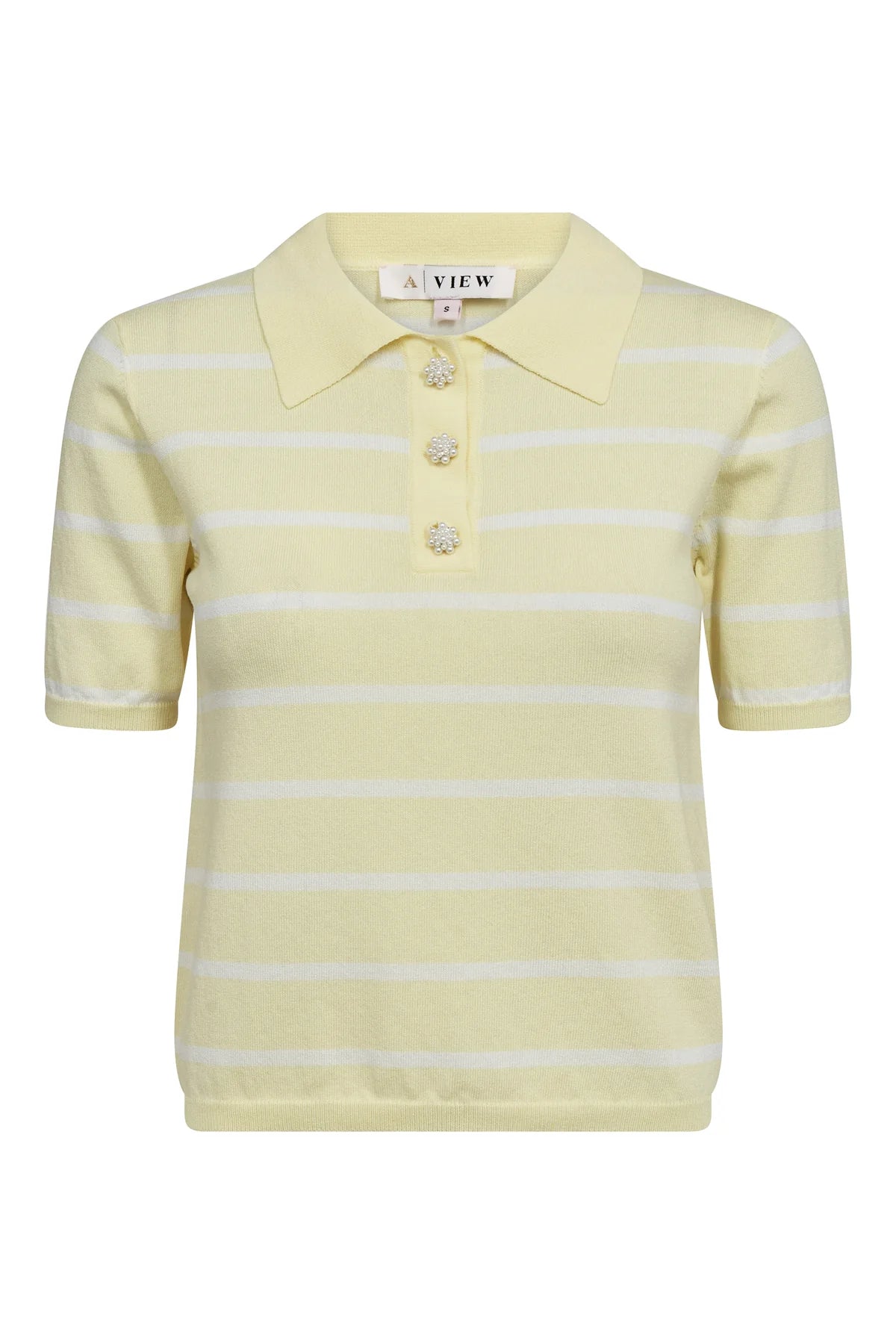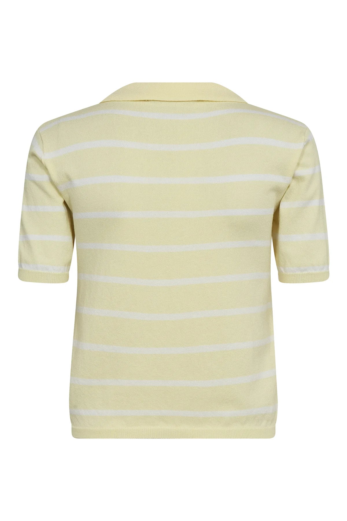 Elo Knit Polo er en elegant og avslappet strikket bluse med korte ermer og klassisk polo-krage. Den kombinerer et tidløst uttrykk med feminine detaljer som delikate perleknapper i front. De horisontale stripene gir plagget et moderne preg og gjør den enkel å style både til hverdags og mer pyntede anledninger.