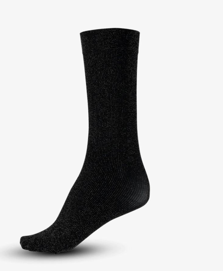 Den svarte, skinnende finishen gir et eksklusivt preg, enten du bruker dem i sneakers, loafers eller til et mer pyntet kveldsantrekk. Sokkene er laget i myk og elastisk polyamid som sitter godt på foten hele dagen – og hele natten.