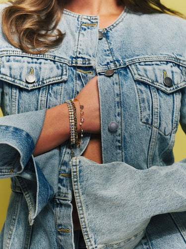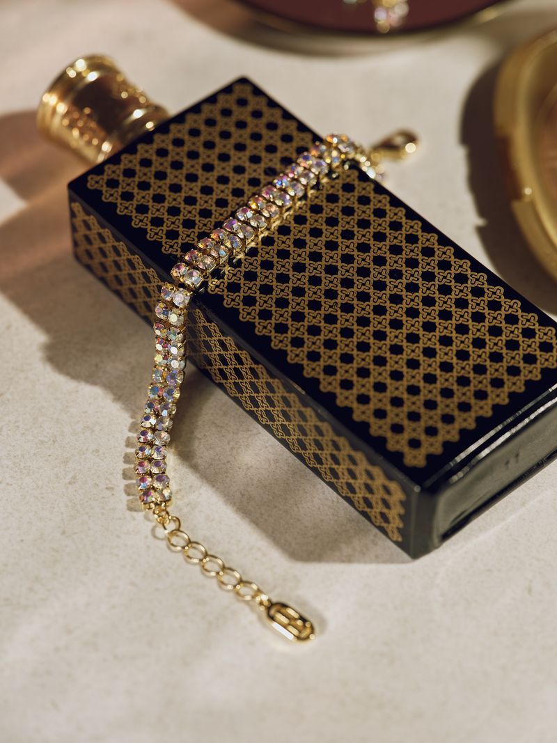 Et tidløst, rått og samtidig glamorøst armbånd dekorert med to rader krystallsteiner i Aurora Borealis effekt. Designet for å passe til alt!