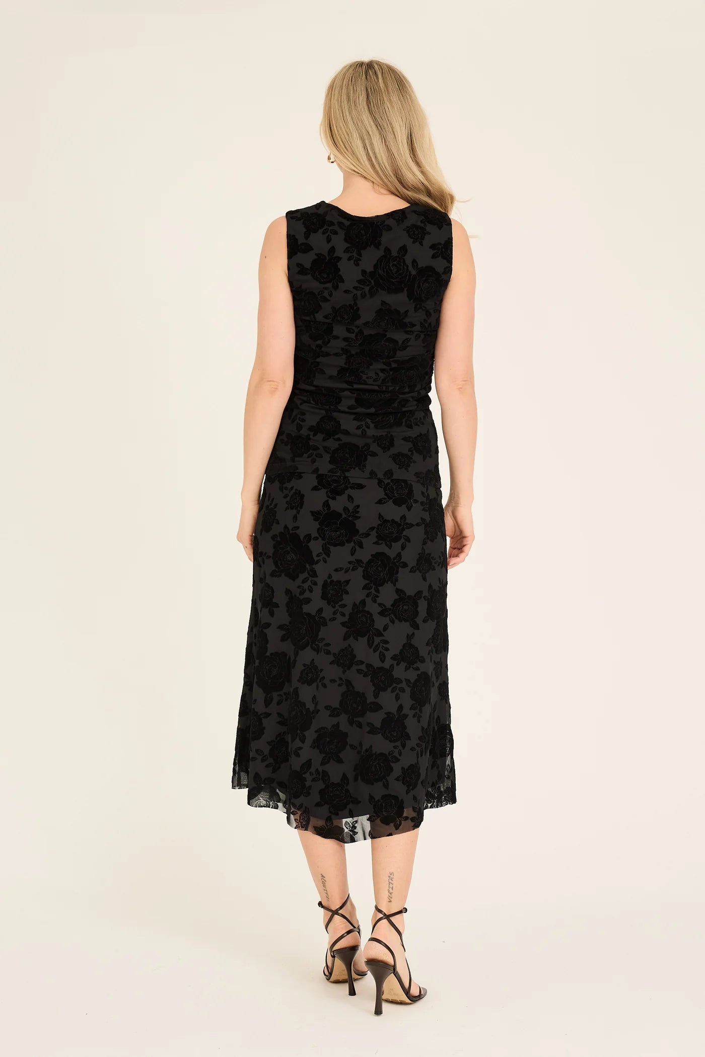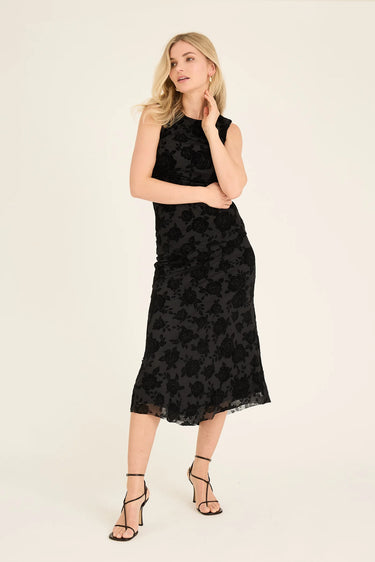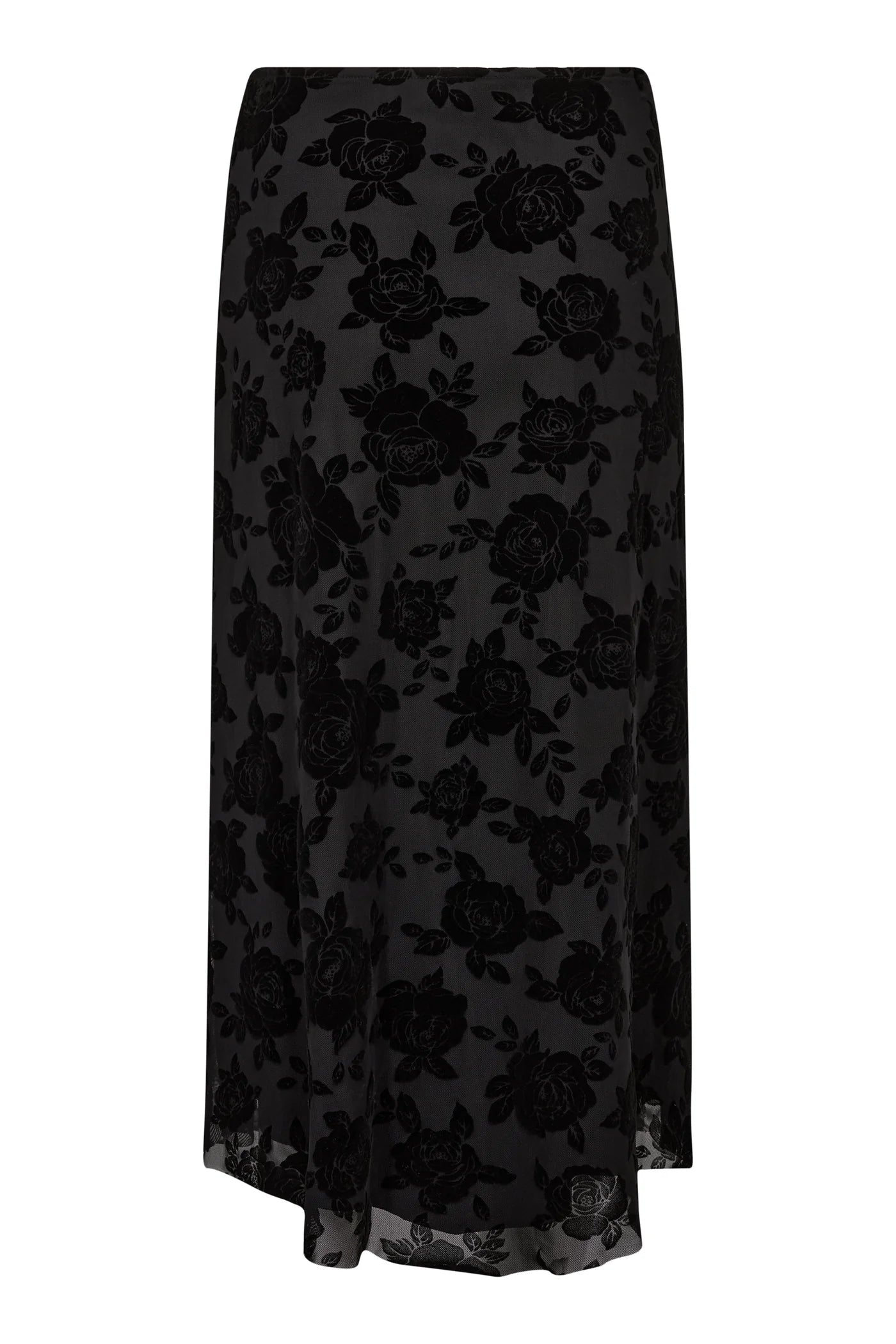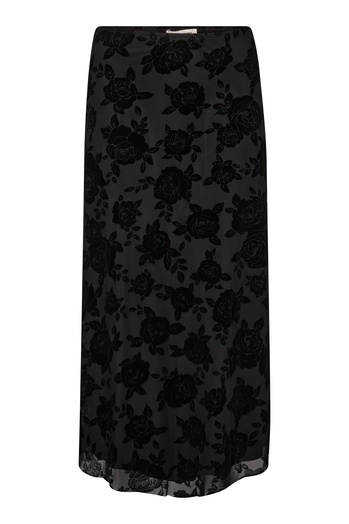 Claudine Skirt kombinerer et feminint uttrykk med moderne komfort. Denne midi-lange nederdelen er designet i lett og transparent mesh, dekorert med vakre fløyelsblomster som gir et eksklusivt, taktilt preg. Fasongen er tettsittende uten å stramme, og den elastiske linningen sørger for en behagelig passform som følger kroppens bevegelser.