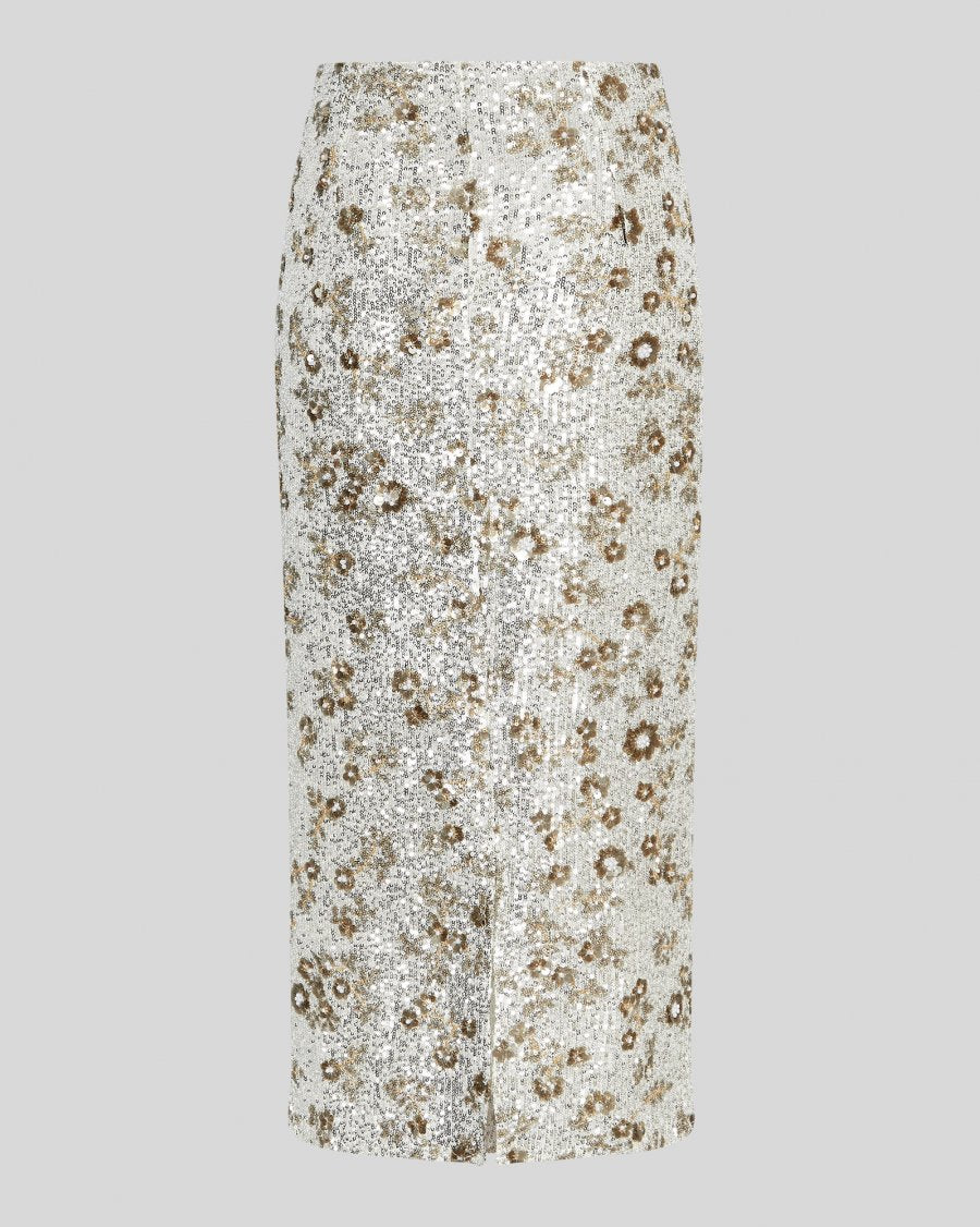 Magnolia HW Skirt EMB fra Moss Copenhagen (MSCH) er et sofistikert paljettskjørt designet for å løfte ethvert antrekk – enten du skal på fest, middag eller ønsker å tilføre hverdagslooken et snev av glamour.
