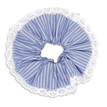 Nydelig hårstrikk / scrunhie i blåstripete med blondekant. Gir ett vakkert og romatisk uttrykk, som passer både til hverdag og fest.