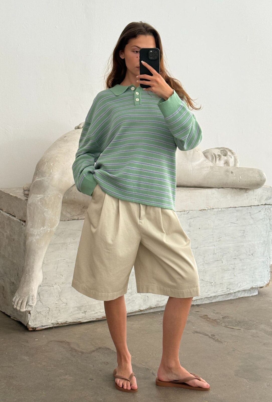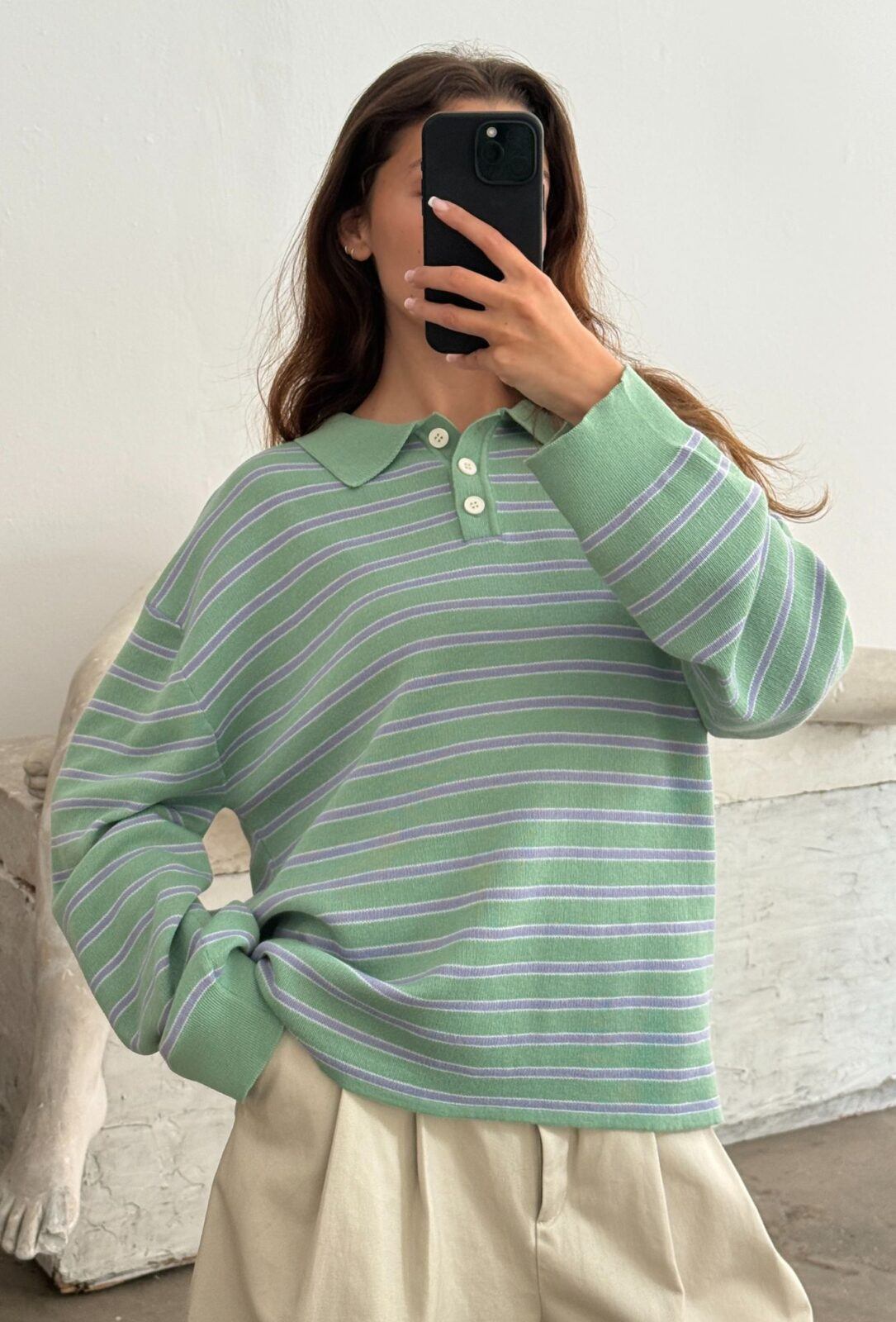 Den myke bomullskvaliteten gjør genseren behagelig å bruke, mens den klassiske polokragen tilfører et tidløst element. Den oversized passformen gir en avslappet silhuett som er enkel å style med både jeans, shorts eller skjørt.