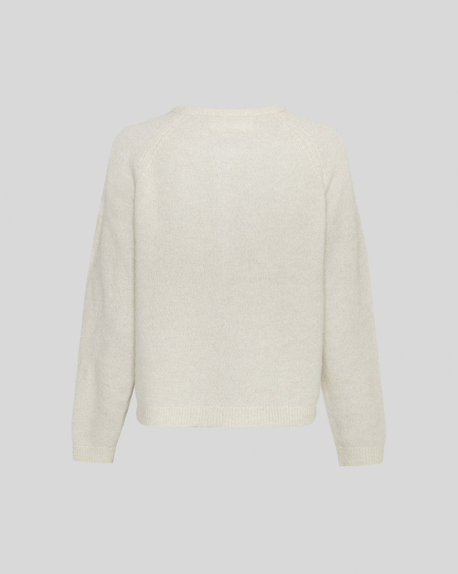 Denne strikkede pulloveren i knækket hvit er en tidløs garderobefavoritt med avslappet passform og eksklusiv materialmiks. Den har rund hals, raglanermer og ribbestrikkede kanter ved hals, ermer og nederkant – detaljer som gir et klassisk og sofistikert uttrykk.