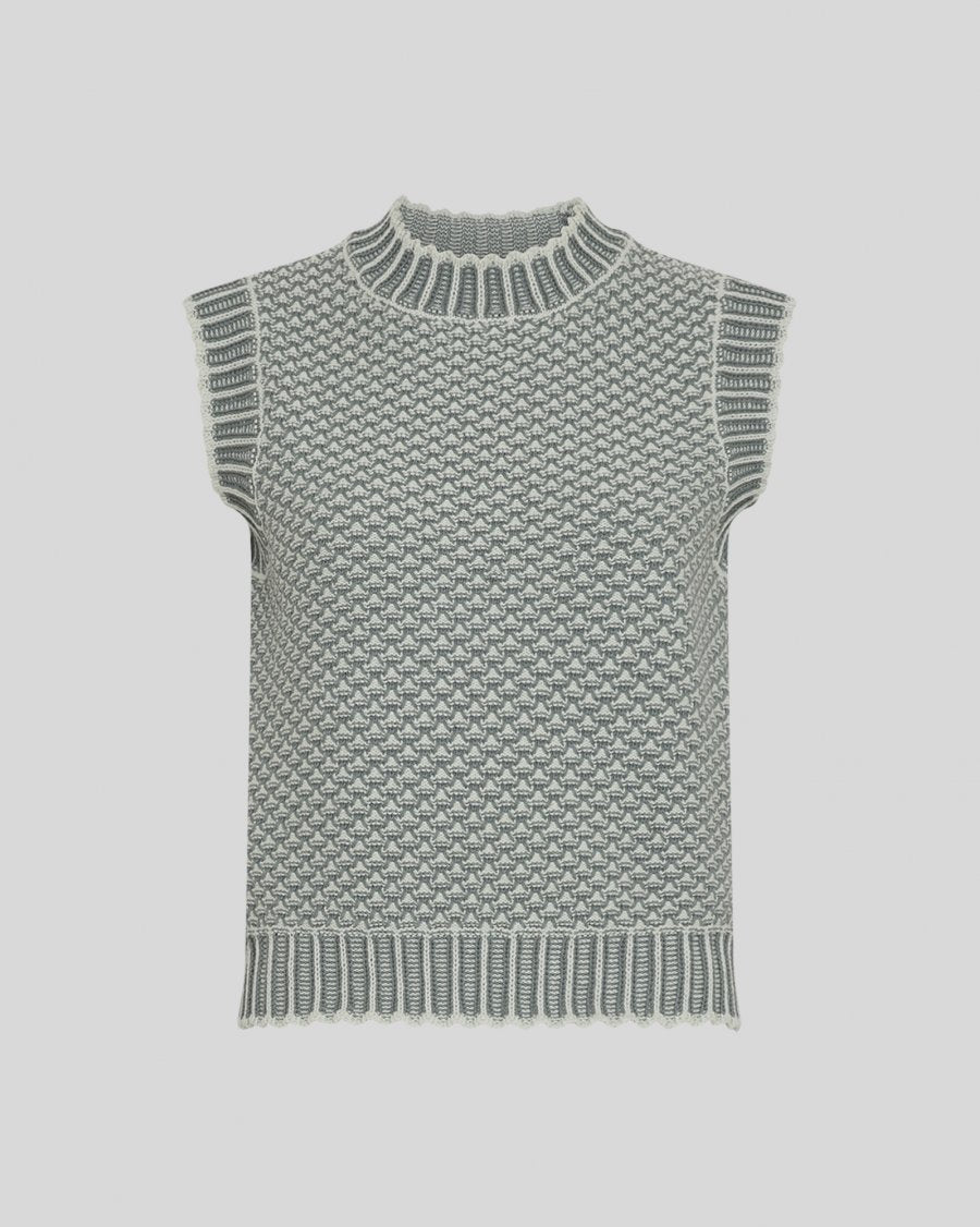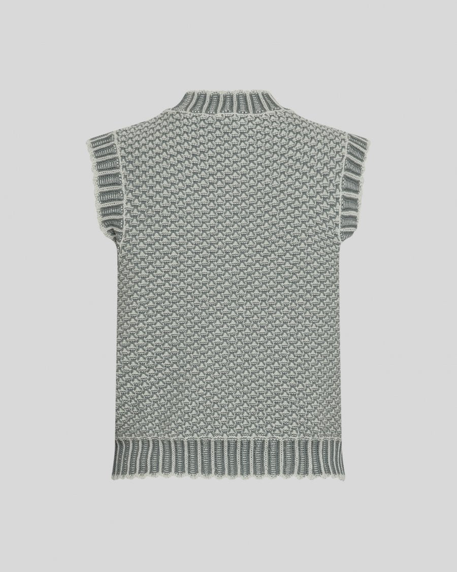 Vesten har ribbestrikket halskant, ribbet nederkant og ærmeløse sidesnitt som gir et rent og gjennomført preg. Den normale passformen gjør den enkel å bruke både over skjorte, bluse eller kjole – eller alene for et mer minimalistisk uttrykk.