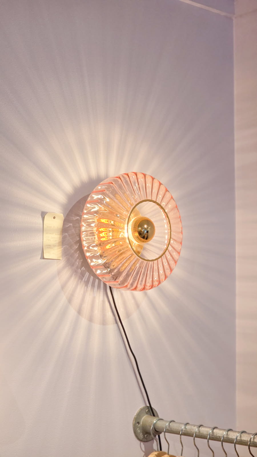 Eksklusiv vegglampe i håndblåst farget glass fra "design by us". New Wave Optic vegglampen kommer i nydelig rosatone og setter et unikt preg på ethvert rom. Ledningen er i sort tekstil (2 meter lang), gir den både funksjonalitet og estetikk.