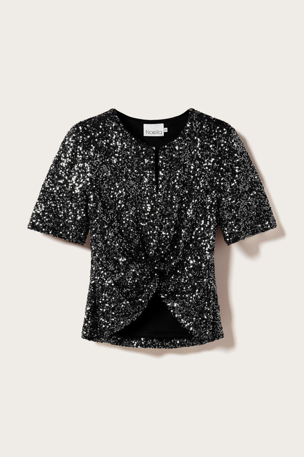 Emon Blouse fra Noella er en glamorøs paljettbluse designet for deg som vil skille deg ut med stil. Den har en vridd front med subtil splitt, som skaper en flatterende fasong og tilfører antrekket et moderne og festlig uttrykk.