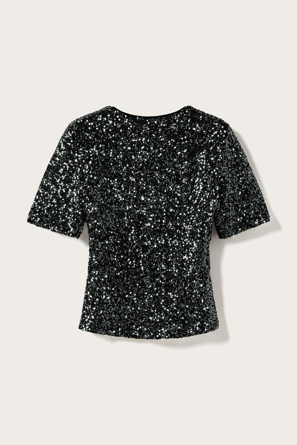 Glitrende paljettbluse med frontvridning og elegant splitt