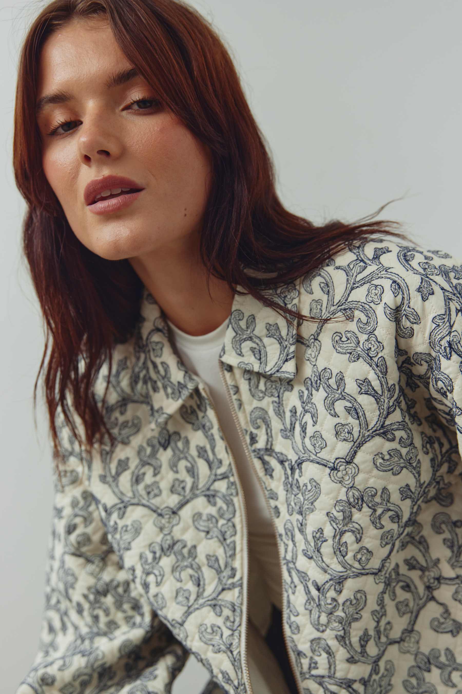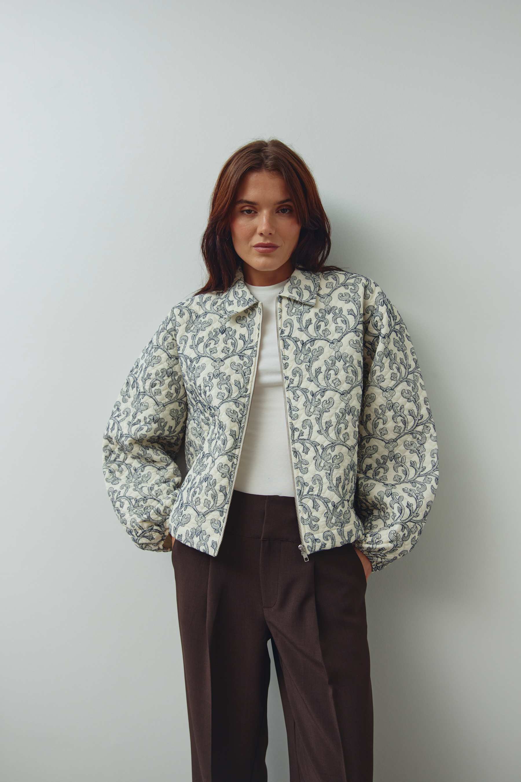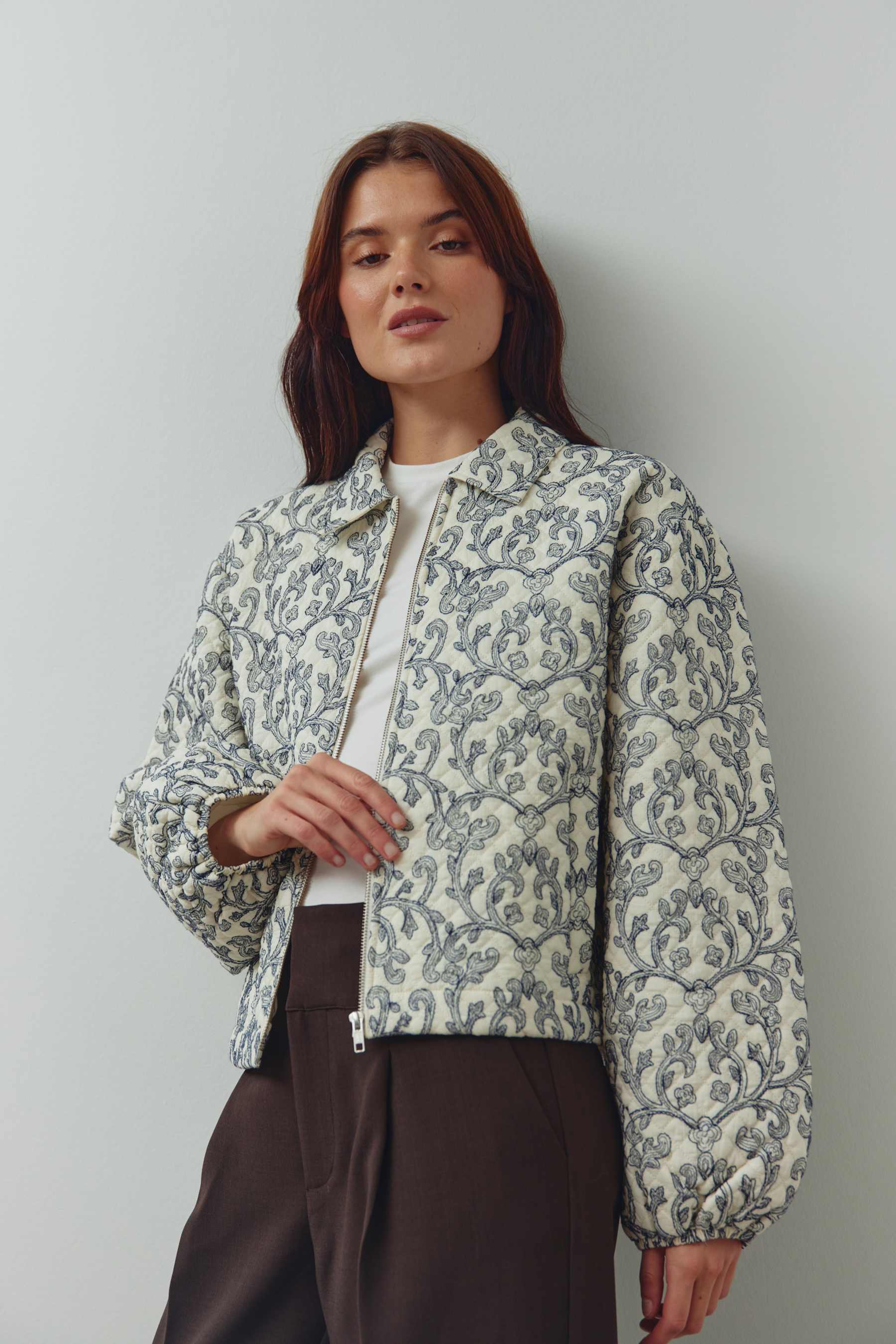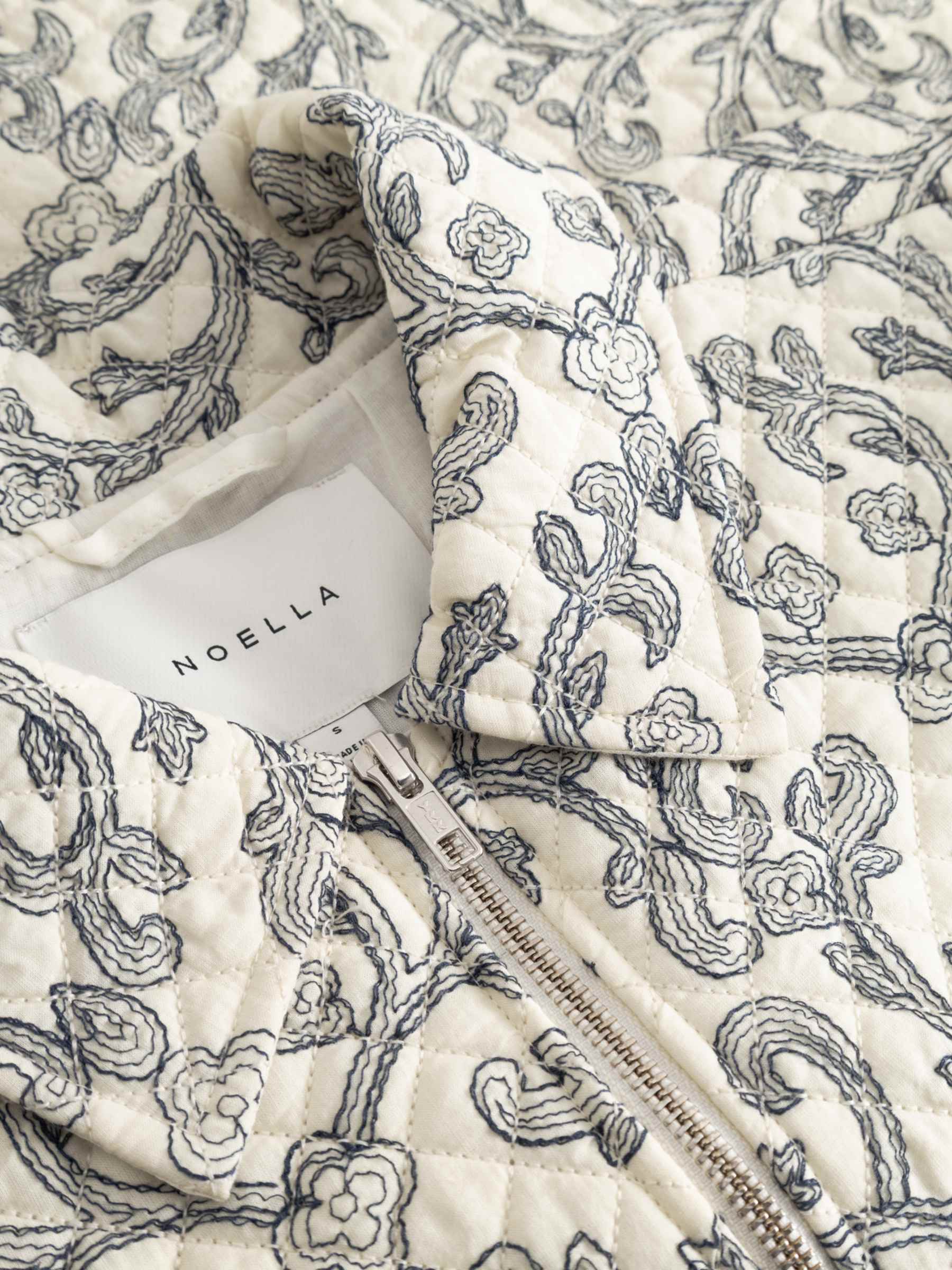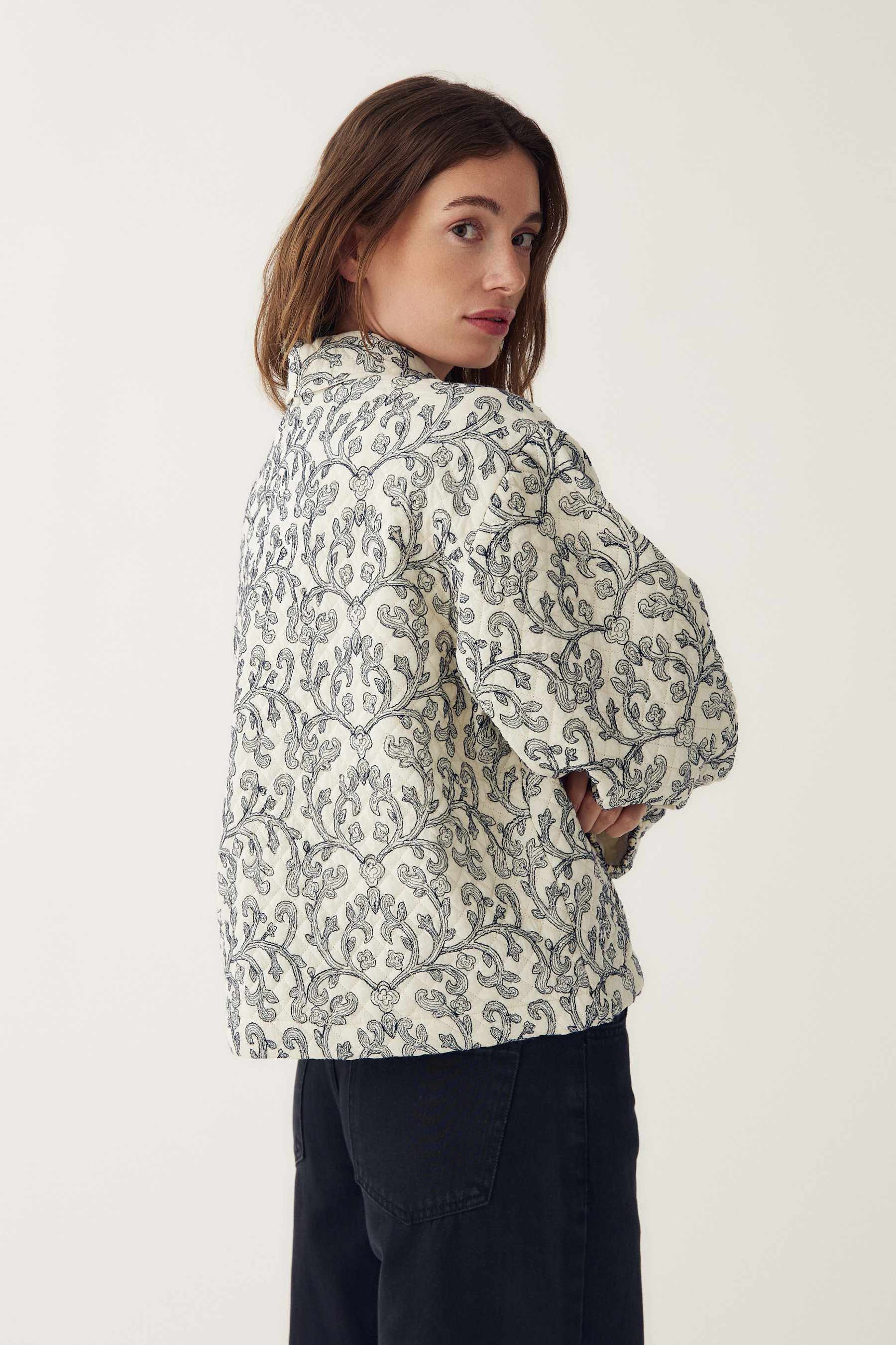 N-Mariam Jacket er en elegant og tidløs kort quiltet jakke i bomull, designet med delikate broderier i en iøynefallende indigoblå kontrast. Jakken kombinerer klassisk håndverk med moderne snitt og gir antrekket et sofistikert, men avslappet uttrykk.