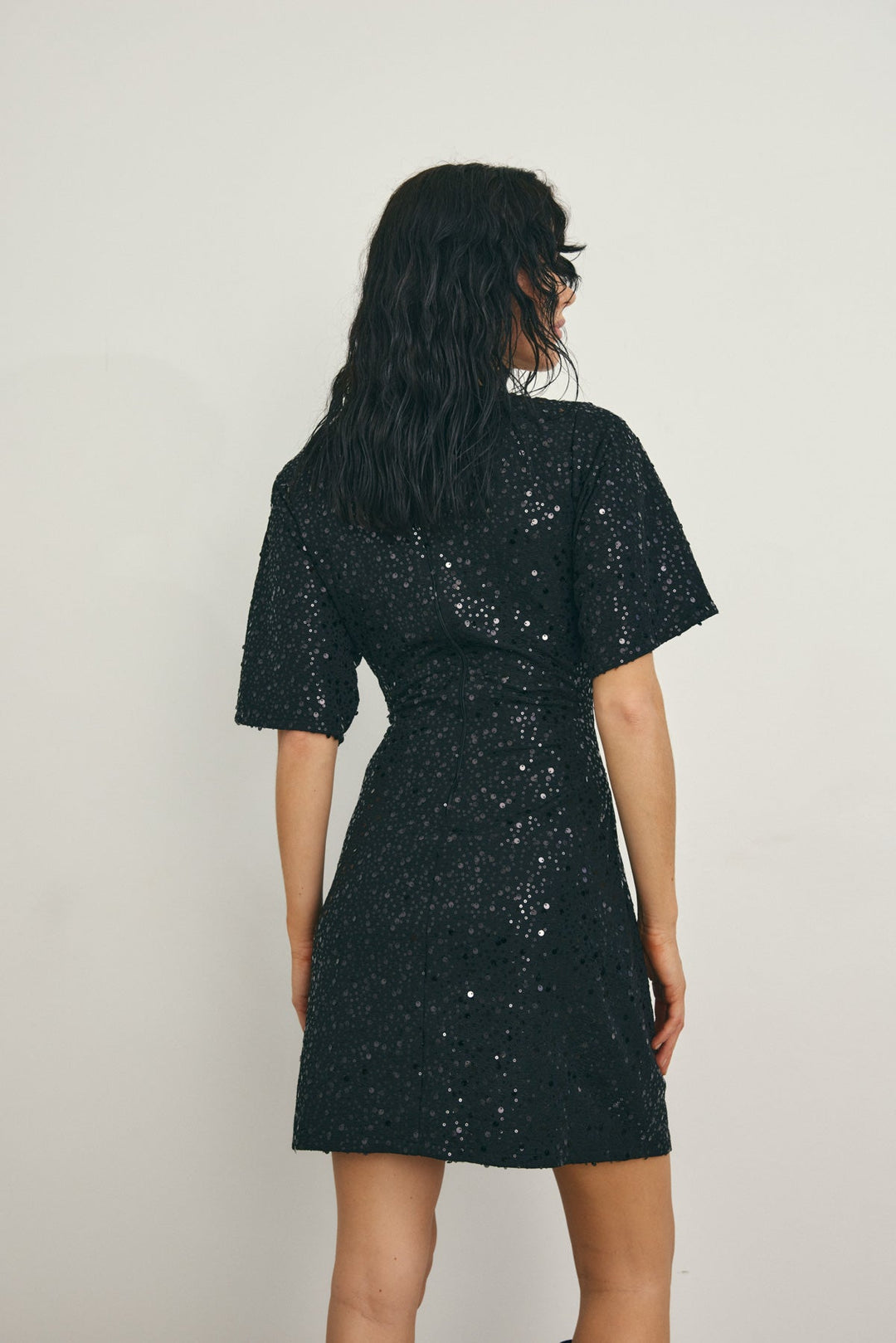 Soli Dress fra Noella er en glitrende festkjole som kombinerer paljetter, feminin passform og komfort på elegant vis. Kjolen har korte ermer, V-hals og smock-detalj foran, som fremhever figuren på en flatterende måte.